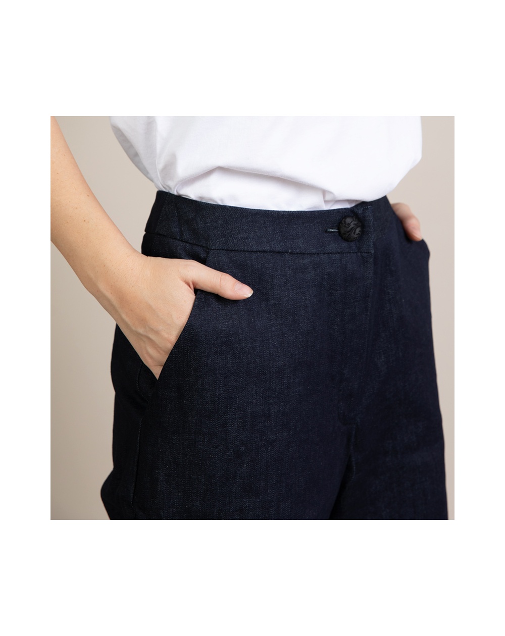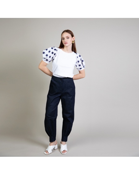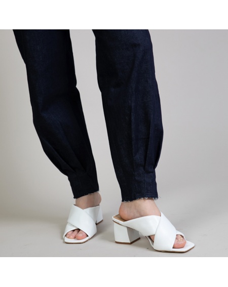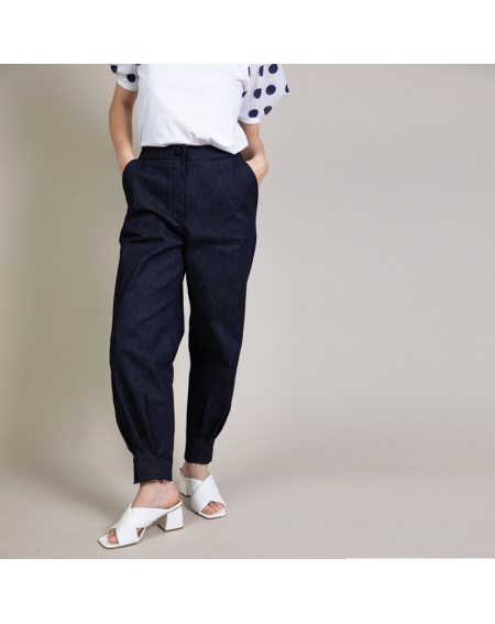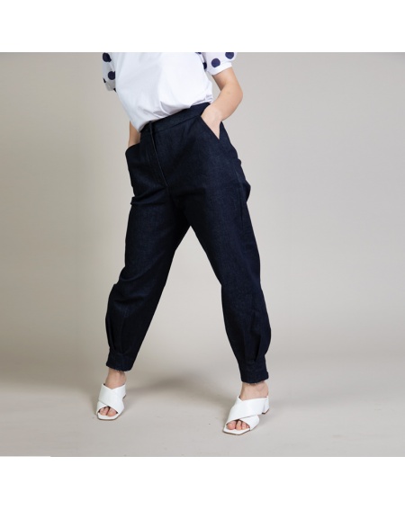 Un jeans un pò diverso dal solito e arricchito con alcuni dettagli come il fondo a pieghe che vanno a stringere il pantalone all'altezza della caviglia.